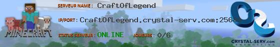 CraftOfLegend Est Un Serveur Semi-RP, Freebuild, Events!!! Le Serveur Fonctionne Sous CraftBukkit 1.7.2 Serveur Entièrement Automatique avec boutique, Vote Automatique, Forum.... Contient plus de 40 Plugins Tous Configurés Par Nos Soins. Map V.I.P , Map Habitants, Avec Architectures Insolites,Modernes Et Originales!! Serveur Datant Depuis Septembre 2013 Avec Une Communauté Soudée Et Expérimentée.
